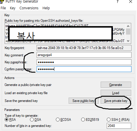 4. puttygen 실행 후 키생성