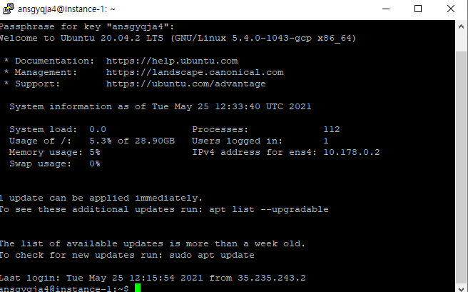 그럼 아이디와 패스워드를 물어볼텐데 당연히 puttygen에서 생성할대 만든 계정을 넣어주면 되겟죠 ??