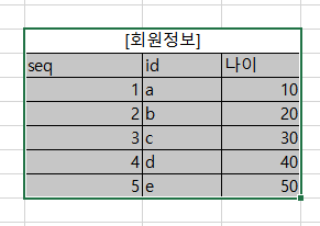 이런경우 insert into [회원정보] (id,'나이') values('e','50') 을 입력하면 아래와 같은 테이블이된다